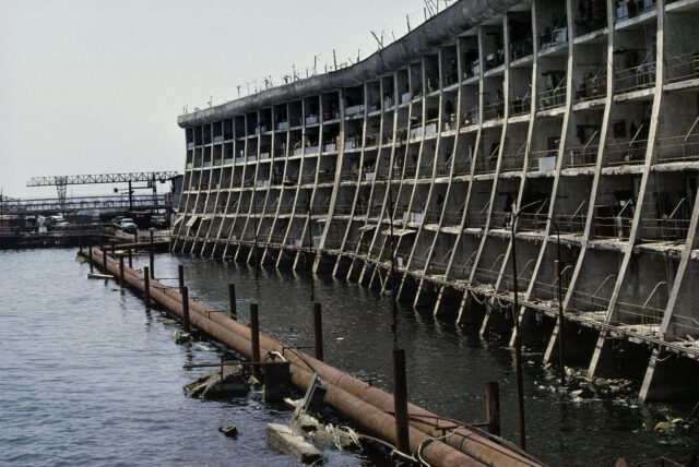Other damage suffered by the city include a large flood that took out the first two floors of some apartment buildings, as well as broken steel beams that crisscross below the water, creating navigational hazardous for boats and ships.