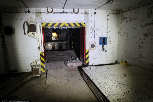 After the first airtight door is an airlock compartment. Nuclear warheads were moved into this compartment first, and then the outside door was locked. Only after this, the second door into the armory would be opened. This was done to reduce the risks associated with the loading and unloading of nuclear weapons.