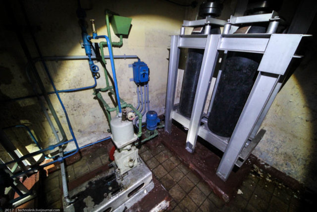 Next are compartments with life support systems. Pictured is a room with a well, a water tank, a boiler, and pumps for delivering water to various systems of the facility.